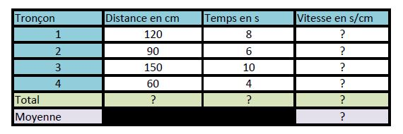 Le mBot réalise un trajet spécifique dans le collège. Dans le tableau ci dessous tu trouveras les distances parcourus par le mBot ainsi que le temps pour effectuer chaque tronçon: