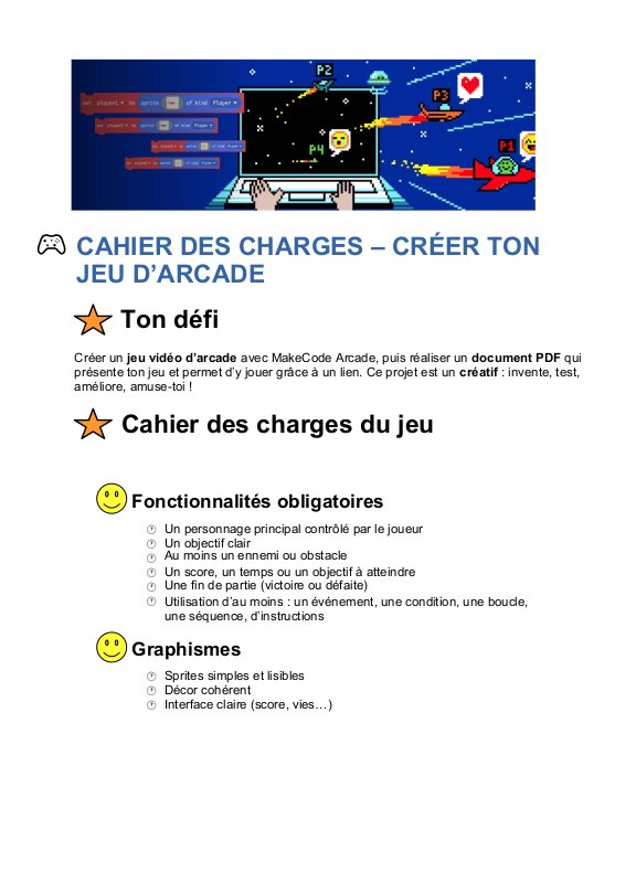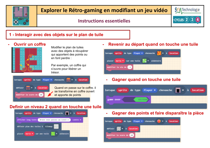 En îlot, Réalise ce programme de labyrinthe: https://makecode.com/_KdkLeahvoUc5lister les modifications que vous souhaitez apporter au programme initial pour réaliser votre jeu personnel :------A l’aide des instructions essentielles en ressources, compléter le programme, tester et valider vos modifications.Un exemple de modifications https://makecode.com/_THMWTiHvMg7XN'oublie pas d'enregistrer ton programmePour aller plus loin :Créer un jeu vidéo d’arcade avec MakeCode Arcade, puis réaliser un document PDF qui présente ton jeu et permet d’y jouer grâce à un lien. Ce projet est un créatif : invente, test, améliore, amuse-toi ! |